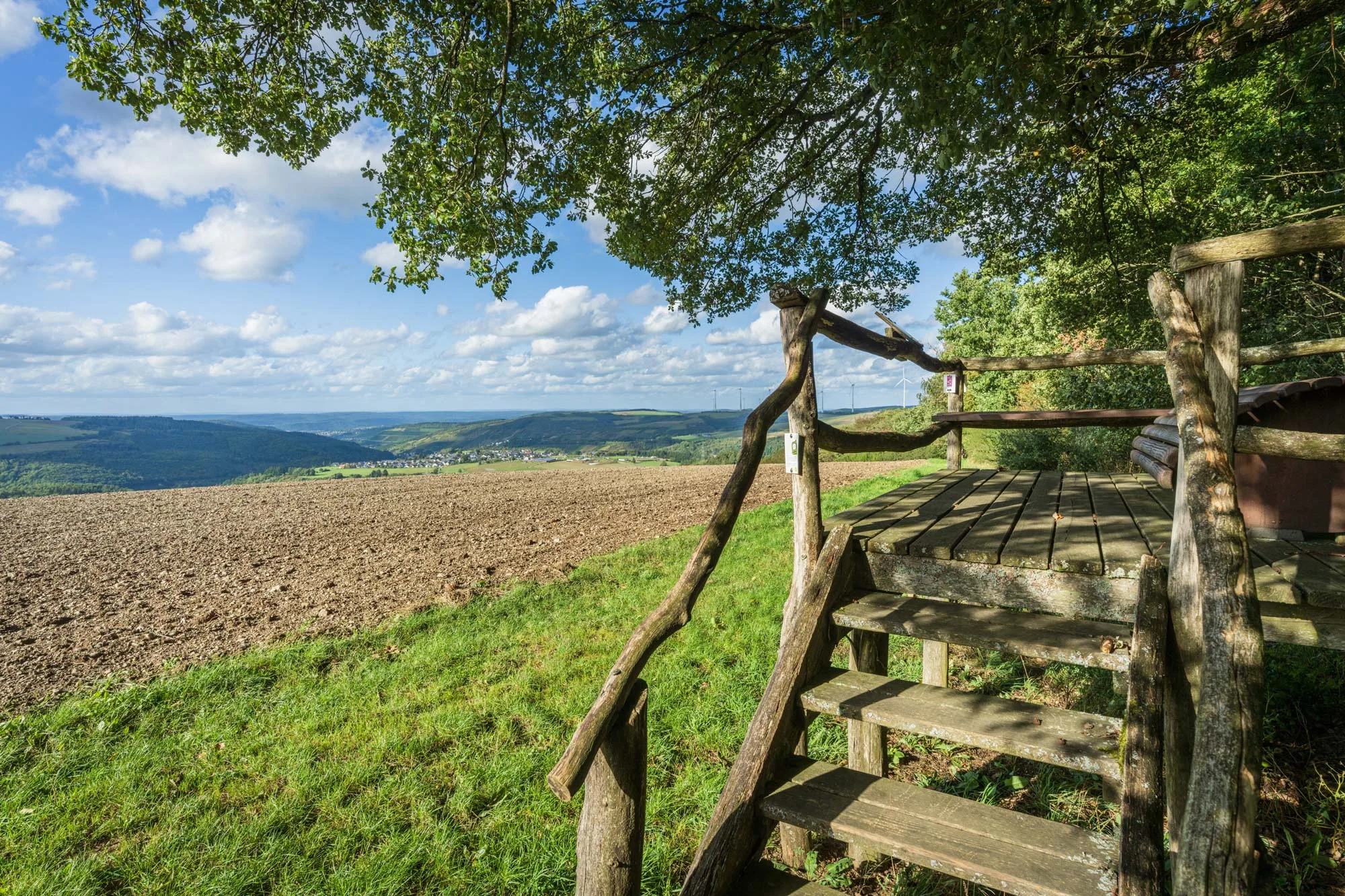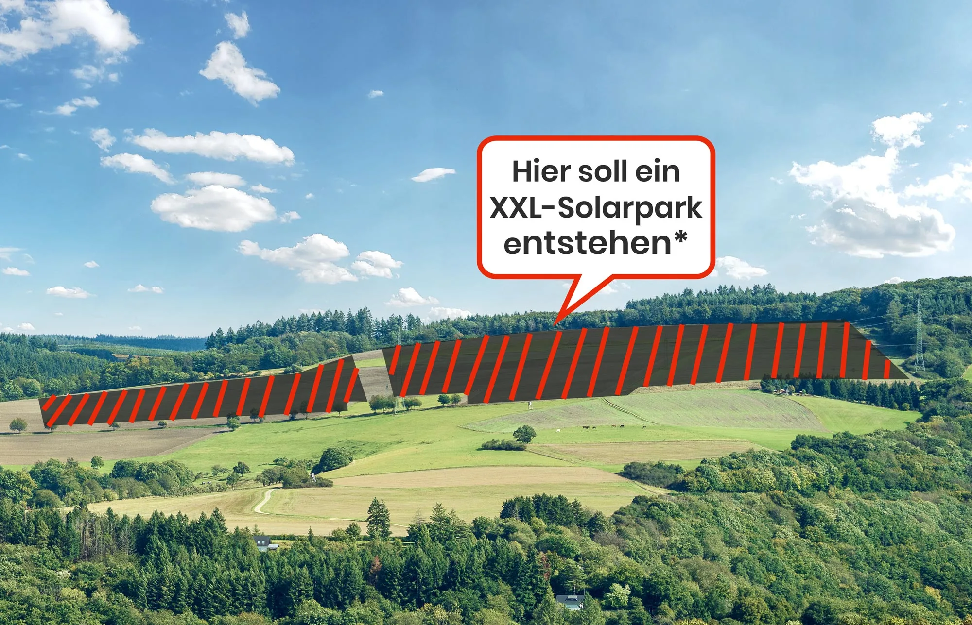 Wer heute auf der Panoramabank Platz nimmt, genießt noch den weiten Blick über Täler und Hügel – doch künftig soll hier ein unendliches Solarfeld liegen. Von „Panorama“ wäre dann keine Spur mehr. Wo heute noch Felder sind, sollen demnächst 3,50 m hohe Solarpanels die Aussicht versperren..